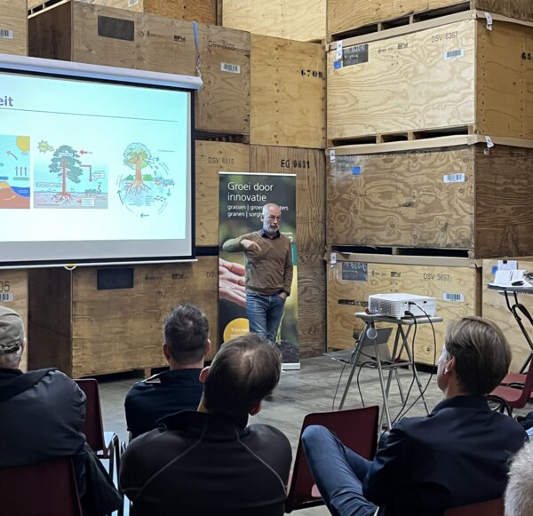 Tijdens zijn presentatie deelde Ajaan Hijmans zijn visie en praktijkervaring met regeneratieve landbouw als fundament voor een toekomstbestendige agrarische bedrijfsvoering. Hij benadrukte het belang van bodemgezondheid en meervoudige waardecreatie binnen een landbouwsysteem dat zowel ecologisch als economisch duurzaam is. Vanuit zijn werk met KAIROS Regenerative Agri & Food Systems liet hij zien hoe directzaai en het inzetten van groenbemesters bijdragen aan veerkrachtige bodems en een robuuste teeltstrategie.