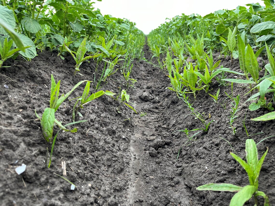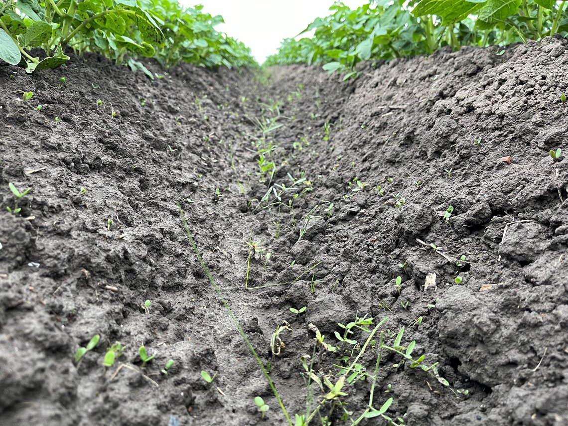 Bij de veldjes die na het frezen gezaaid zijn valt op dat het meeste zaad onderin de rug zakt en daar dus kiemt. Dit geeft weinig bedekking in de eerste paar weken, echter nu de aardappelen groter worden lijkt dit wat beter.
