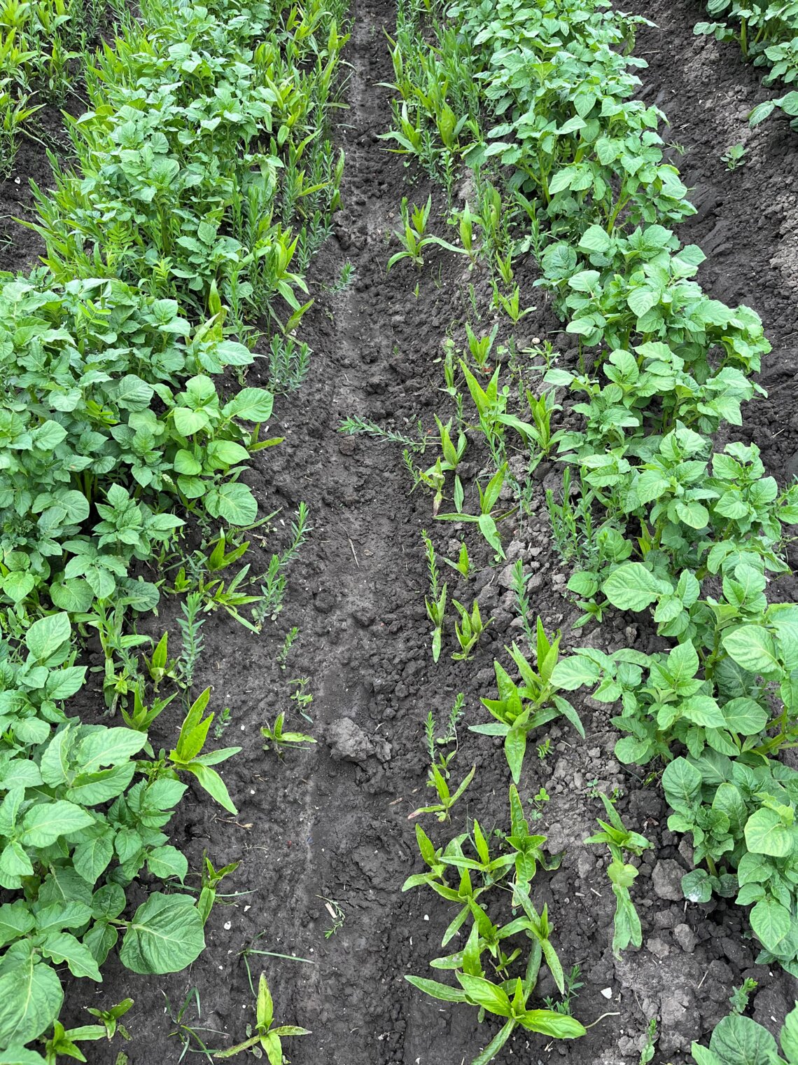 Nicole Bil over de eerste resultaten: ‘Ik sta ervan te kijken dat, zoals het nu lijkt, alle soorten gekiemd zijn van het mengsel na de bespuiting. Verder valt op dat vanaf de opkomst de verdeling over de rug vooral bij de toepassing vóór het frezen heel mooi is. Tot ca. 2 weken geleden vond ik dat de mooiste veldjes. Echter daarna gingen ze concurreren met de aardappelen. Het lijkt erop dat de aardappelen er wel overheen groeien, maar vooral bij de Solanum Pro lijkt de niger behoorlijk te concurreren, dit is wellicht een te forse plant voor de onderzaai.’