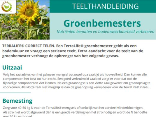 TerraLife is het resultaat van jarenlange kweek- en onderzoekprogramma's; het is de bouwsteen om vergroening en bodemweerbaarheid met elkaar te verbinden. Door TerraLife groenbemestermengsels te telen kunt u voldoen aan de vergroeningseisen. Tegelijkertijd wordt uw bodem verrijkt en het bodemleven gestimuleerd. Ons TerraLife concept bevat mengsels met een veelvoud van soorten die allemaal een specifieke bijdrage leveren in de bodem. De mengsels zijn door onze jarenlange ervaring uitgebalanceerd zodat de verzaaibaarheid goed is en alle componenten tot hun recht komen.