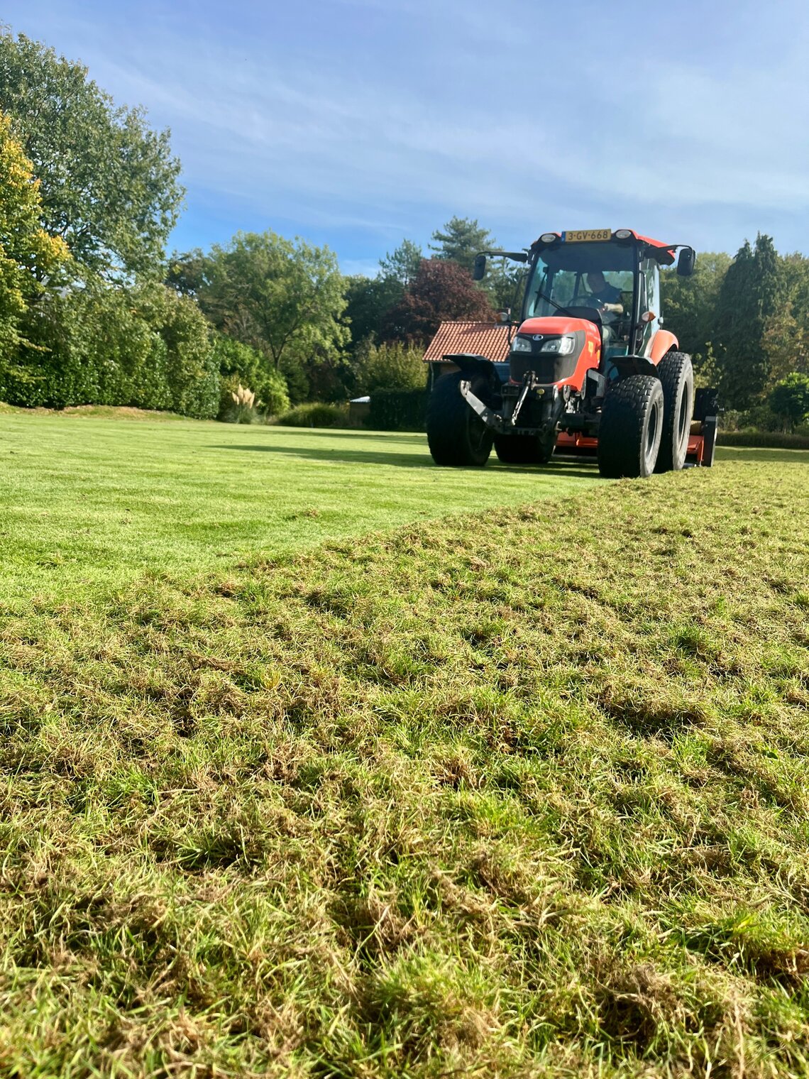Na het opvegen van het verticuteersel is het gazon doorgezaaid met EUROGRASS Sportivo — een mengsel dat speciaal is ontwikkeld voor gazons die soms intensief gebruikt worden maar ook een sierlijke uitstralingen dienen te hebben.