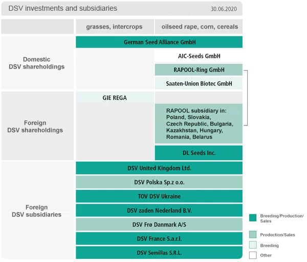DSV heeft belangrijke deelnemingen in bekende bedrijven in de zaadindustrie in Duitsland en daarbuiten en heeft volledige dochterondernemingen in Denemarken, Groot-Brittannië, Frankrijk, Nederland, Polen, Argentinië, Oekraïne en Canada.