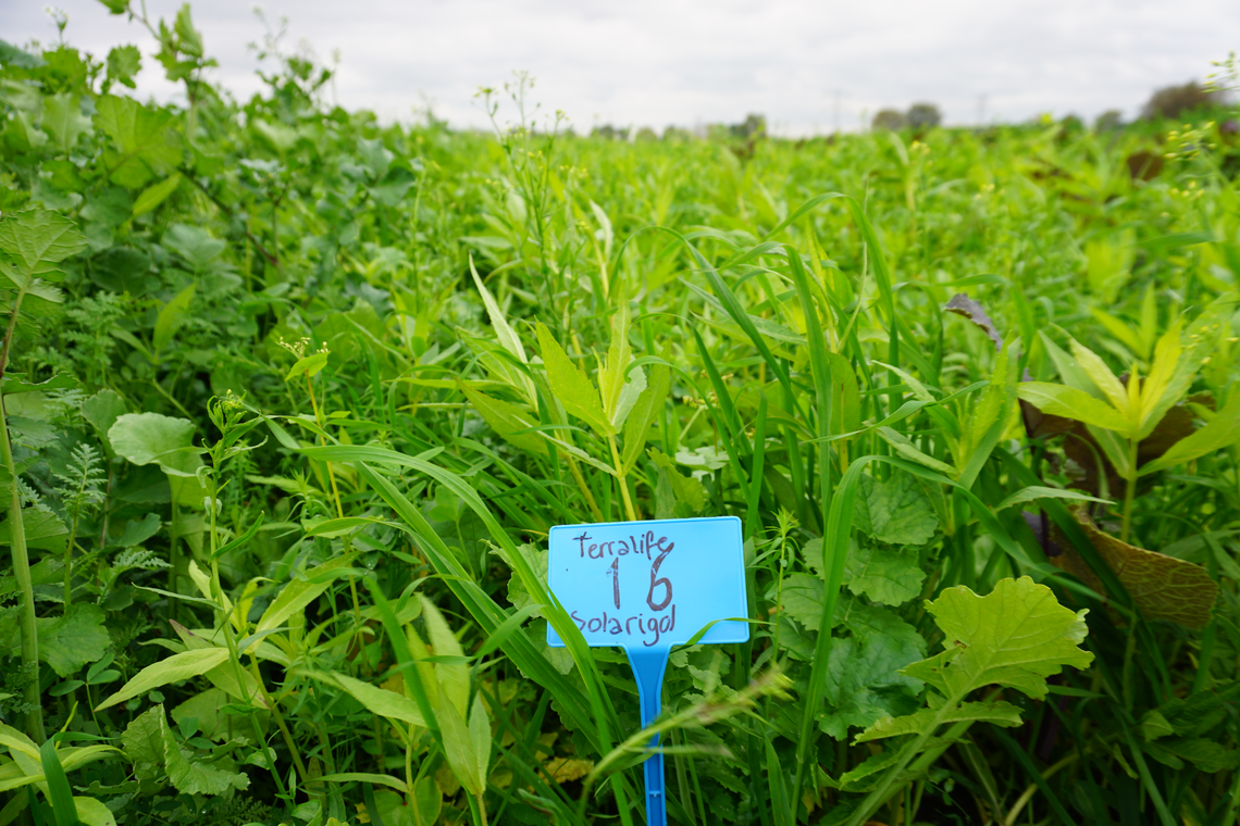 De serieuze aandacht betaalt zich uit want alle mengsels zijn goed aangeslagen en volop in groei. ‘’Een aantal mengsels, zoals TerraLife® N-Fixx 50, zijn extra geschikt voor NKG. Deze leken wat trager op gang te komen maar ze hebben het veld inmiddels goed dicht getrokken’’ geeft Lucas aan. Op dit moment zijn er geen verschillen tussen de perceelshelften. Wel is er na het blauwmaanzaad wat opslag die soms zichtbaar is onderin de groenbemestermengsels. Zes mengsels komen uit het TerraLife® programma van DSV en één mengsel is Non Labour met vlas en deder bijgemengd waar Lucas al jaren goede ervaring mee heeft.
