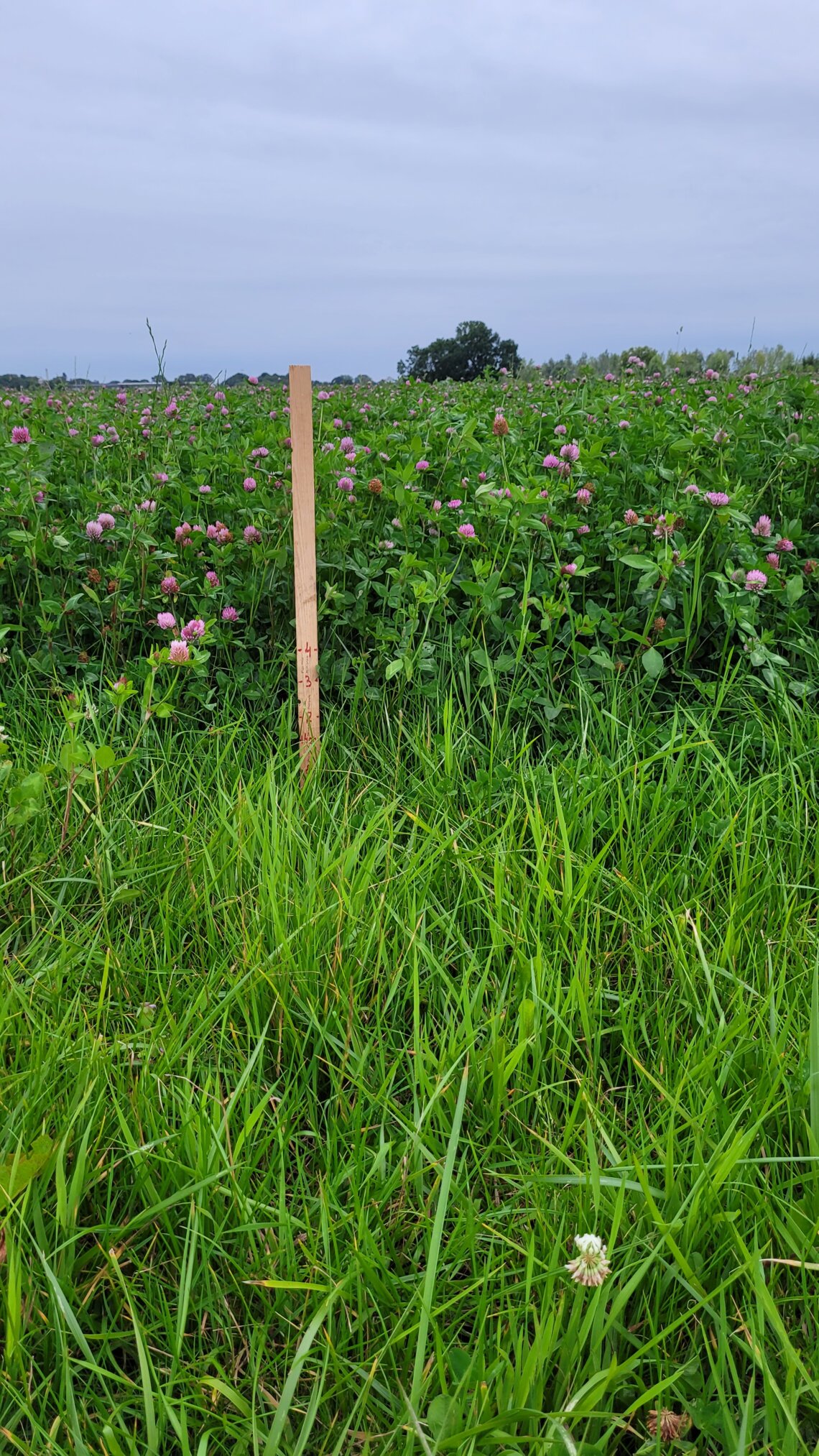 Foto rechts: De zelfgemaakte grashoogtemeter verdwijnt bijna tussen de klaver.