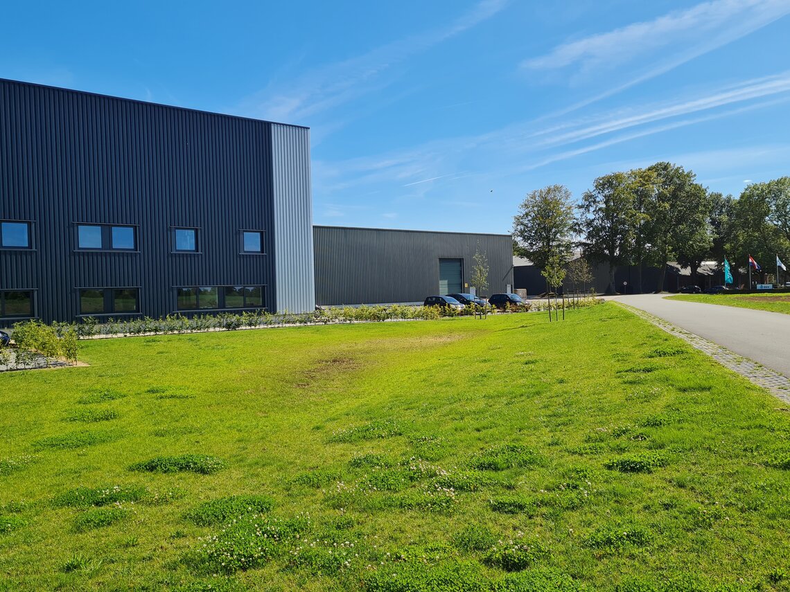 Daarna volgde dit jaar een extreem lange natte periode. Wiersema: “Het mooie is, dat ook daar rietzwenkgras laat zien dat het echt standvastig is. In de wadi naast ons magazijn zit het mengsel EUROGRASS Campino met 80% rietzwenk. Daar zien we dat het gras ook daar prima stand houdt en het water kan managen. Het diepe wortelstelsel van rietzwenkgras absorbeert niet alleen water tijdens regenachtige periodes, maar kan het ook vasthouden voor gebruik tijdens drogere perioden. In landschapsarchitectuur wordt rietzwenkgras daarom vaak gebruikt om hellingen en oevers te verstevigen. Zijn sterke wortels verminderen het risico op bodemerosie.”