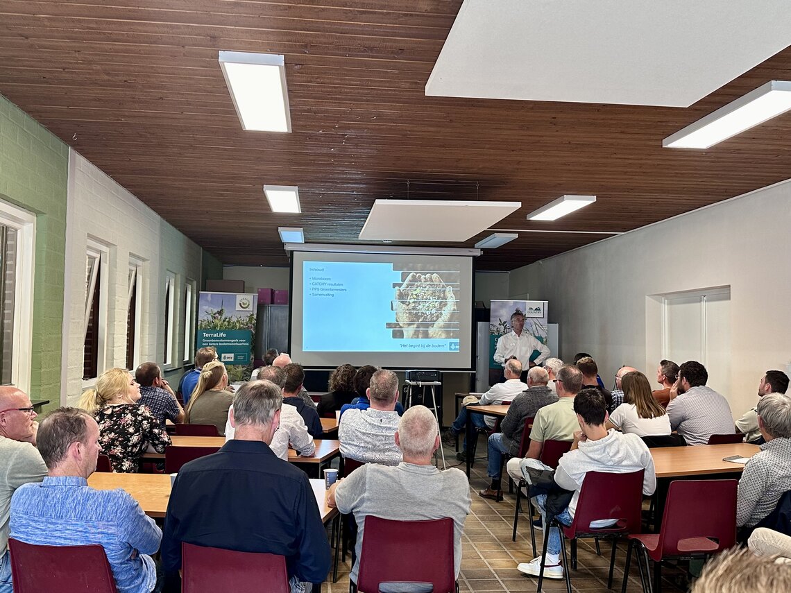 Daarna deelde Jos de resultaten uit het 9-jarig CATCHY onderzoek en de uitkomsten van de PPS Groenbemesters. Het CATCHY project is een onafhankelijk 9-jarig onderzoek in Duitsland dat in september 2023 werd afgerond. De effecten in een meerjarige rotatie werden gemeten op twee locaties. Daarbij werd gebruik gemaakt van braak, monocomponenten en ook een soortenrijk TerraLife® mengsel. Belangrijk aan dit onderzoek is dat naast de werking van de mengsels tijdens de teelt ook gekeken werd naar de effecten van de mengsels op de volgende (hoofd-)teelt. De resultaten zijn onlangs gedeeld in een 2-daags symposium in Asendorf (Dld.). Belangrijkste uitkomst van dit onderzoek is dat bodemverbetering een dynamisch, doorlopend proces is. De 4 principes voor een gezonde bodem zijn: