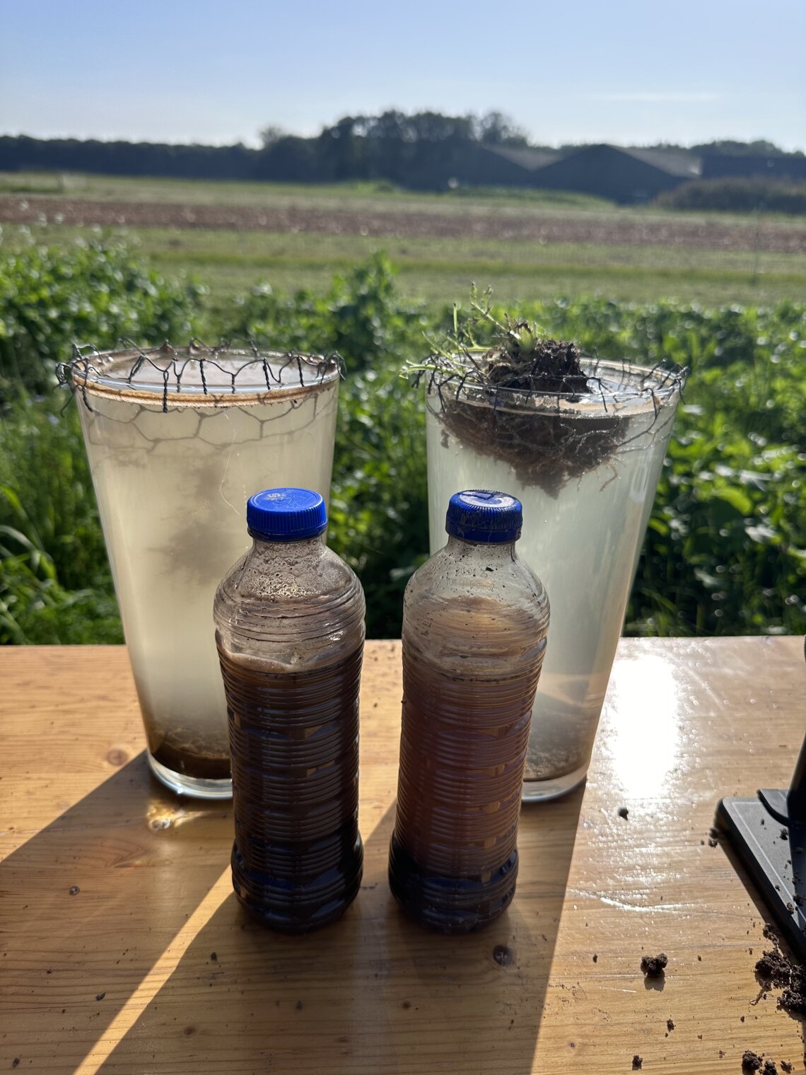 Door middel van enkele eenvoudige proeven kan je al veel zien in de bodem. Roy Kuenen liep met de aanwezigen door verschillende proeven heen en liet zien hoe je tests kan nemen van de bodem. Er was een duidelijk verschil te zien in de bodem tussen een proef met de grond van een braak perceel en de grond van een perceel met een groenbemester: de wortels van de groenbemester houden de bodem beter vast en voorkomen uitspoeling van water en erosie. Met een microscoop werden de schimmels en stikstofknolletjes bekeken. Ook het aantal en de verschillende soorten regenwormen zijn van groot belang voor een goede bodem.