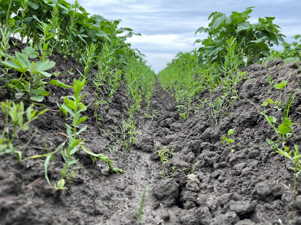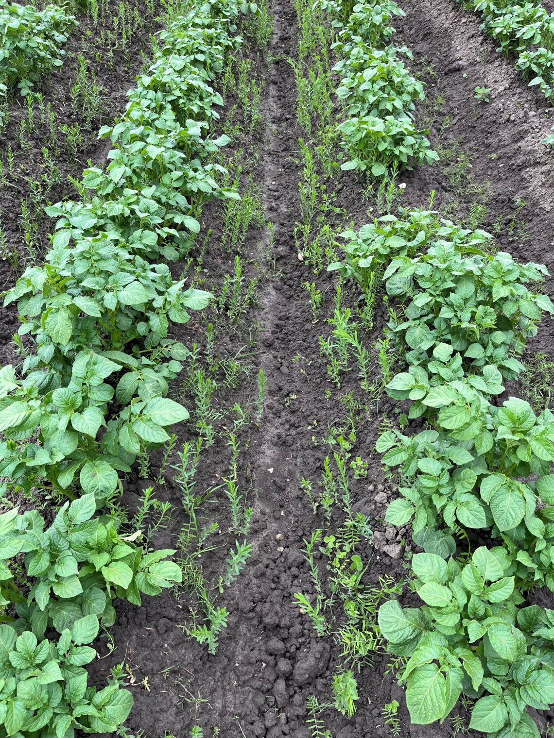 Nicole Bil over de eerste resultaten: ‘Ik sta ervan te kijken dat, zoals het nu lijkt, alle soorten gekiemd zijn van het mengsel na de bespuiting. Verder valt op dat vanaf de opkomst de verdeling over de rug vooral bij de toepassing vóór het frezen heel mooi is. Tot ca. 2 weken geleden vond ik dat de mooiste veldjes. Echter daarna gingen ze concurreren met de aardappelen. Het lijkt erop dat de aardappelen er wel overheen groeien, maar vooral bij de Solanum Pro lijkt de niger behoorlijk te concurreren, dit is wellicht een te forse plant voor de onderzaai.’