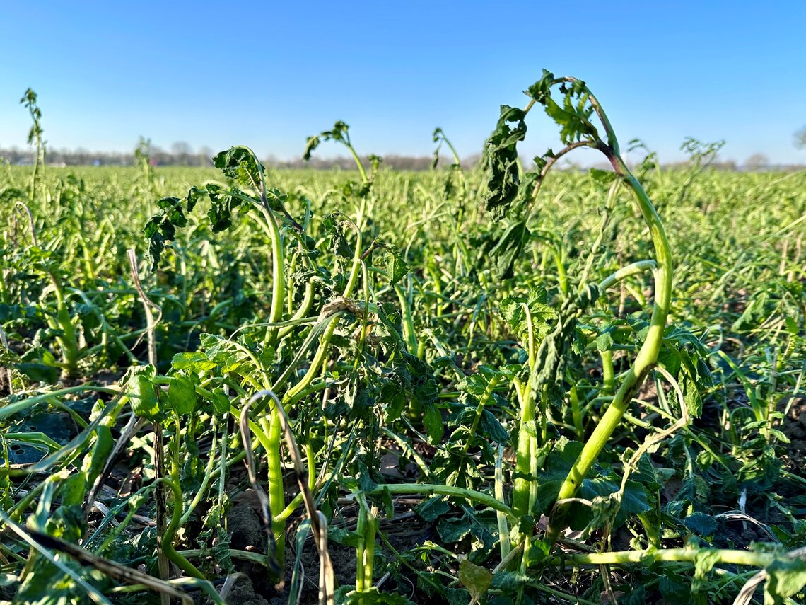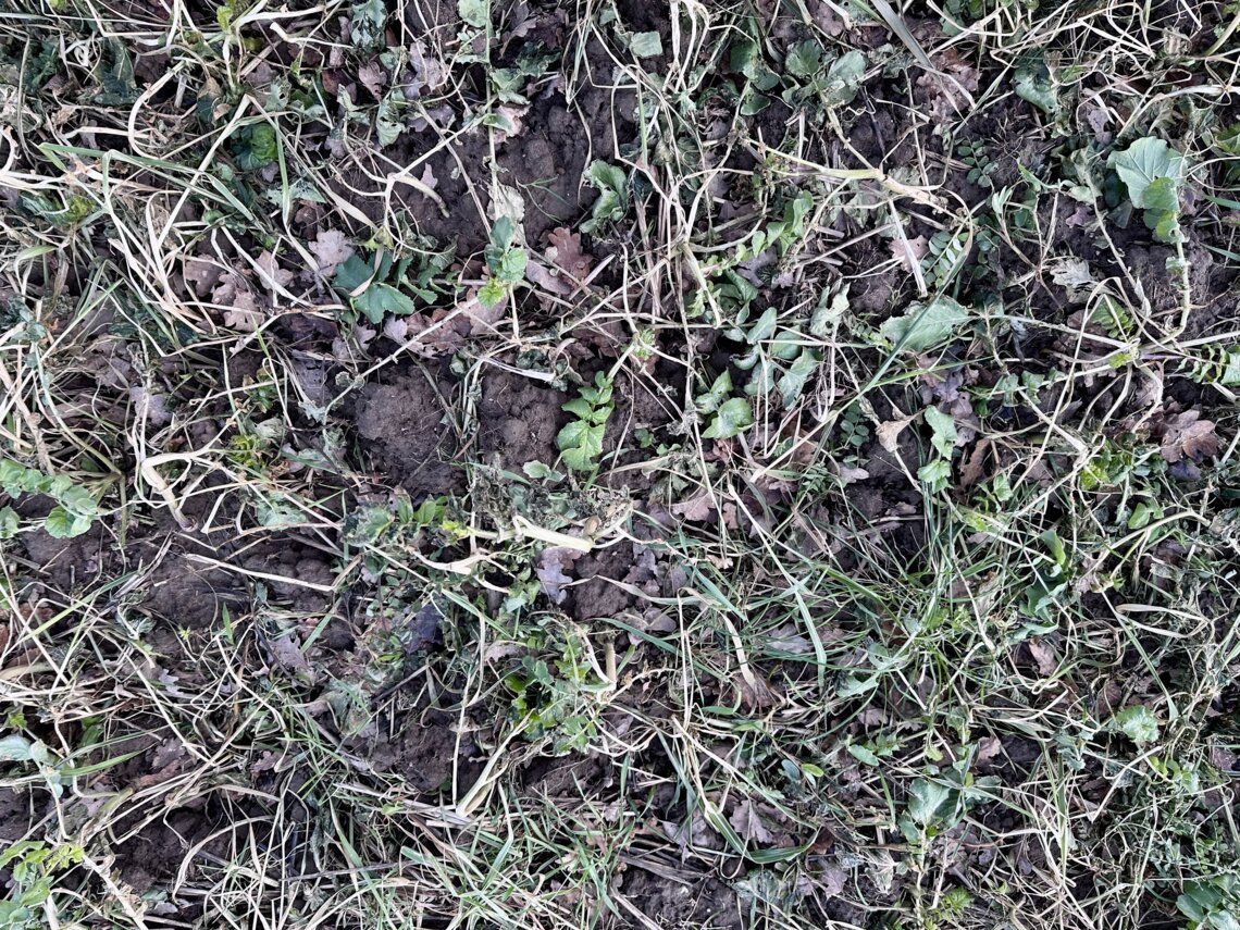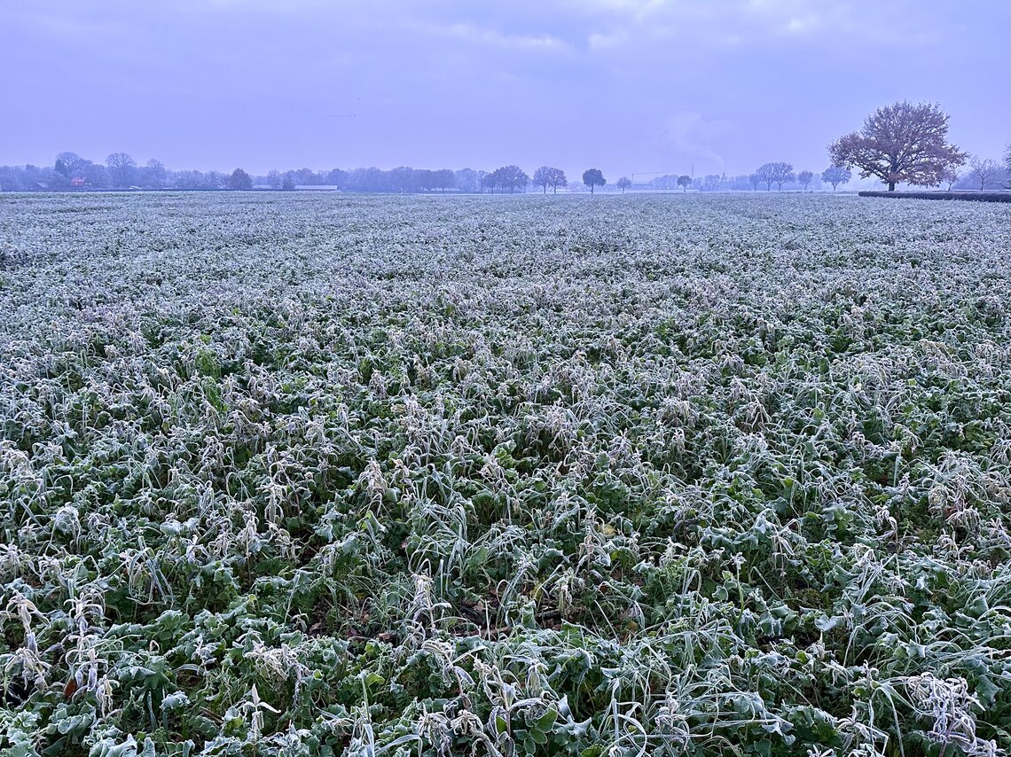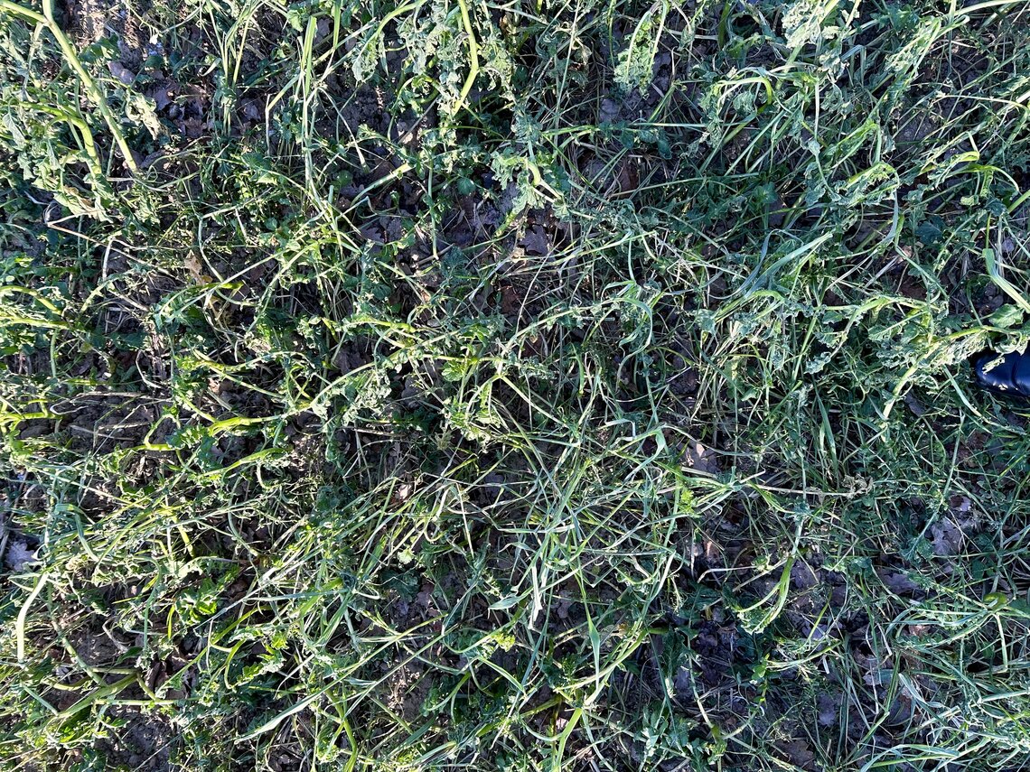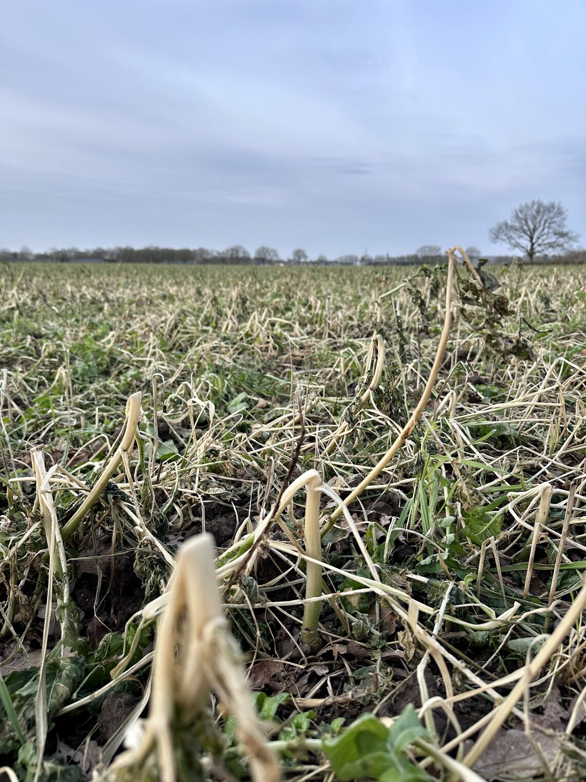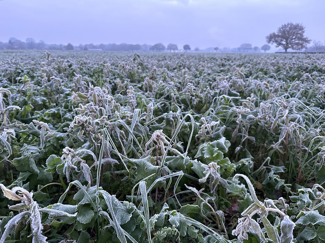 We nemen een kijkje op dinsdag 23 januari om te kijken hoe het veld na 2 weken uit de vorstperiode is gekomen. Het veld is nog wel overwegend groen, maar de meeste planten beginnen af te sterven. Van grote waterplassen of natte plekken, welke we op vele akkers zien door de extreem natte winter is op dit perceel geen sprake.